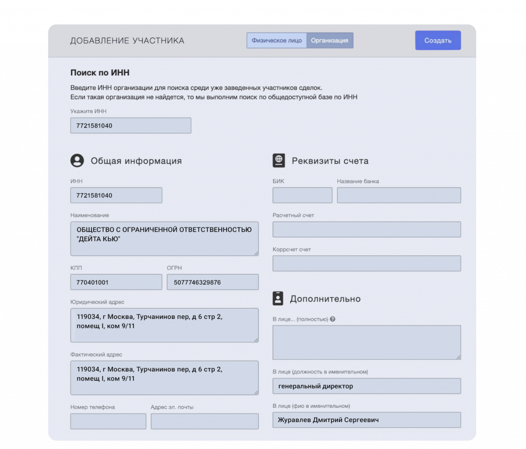 Когда к застройщику обращается клиент — гражданин или юрлицо, — CRM создает карточку лида. Там менеджер заполняет массу сведений о клиенте. В том числе реквизиты организации или адрес регистрации физлица.