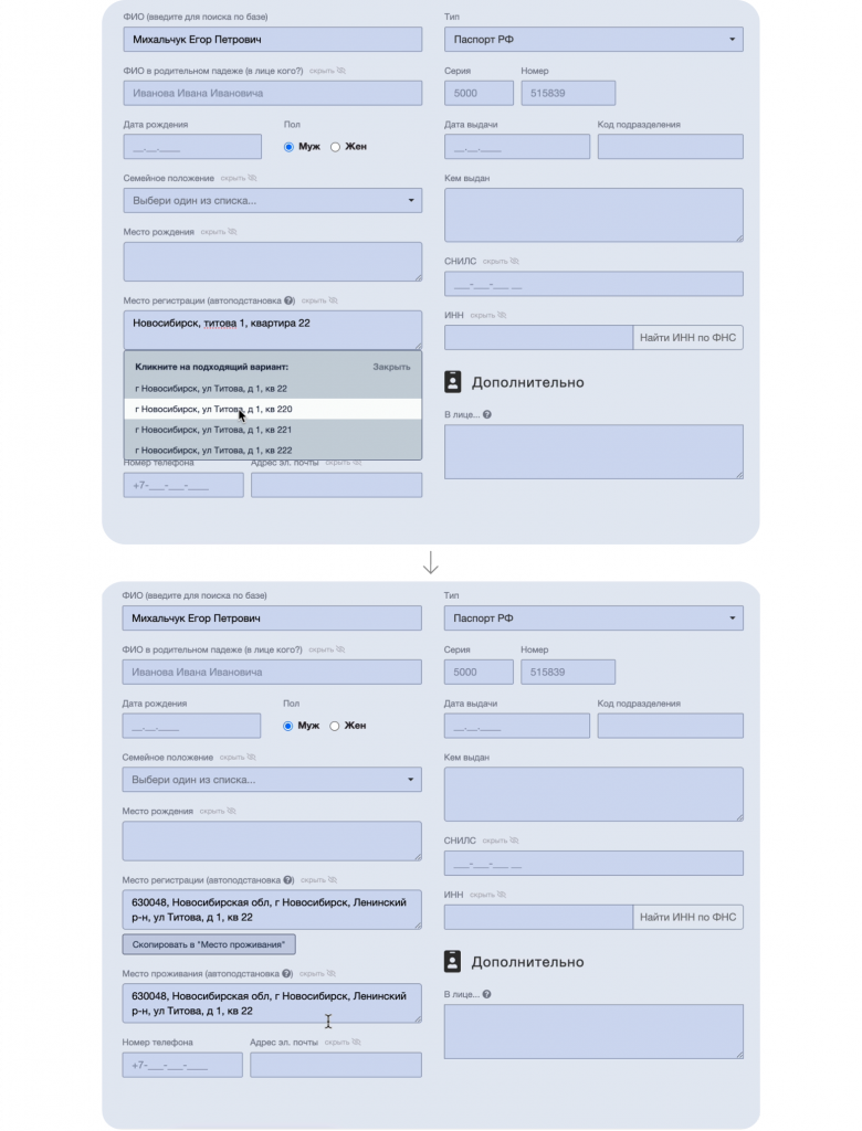 В карточку физлица внедрили сервис «Подсказки по адресам». Теперь менеджеру застройщика достаточно ввести первые буквы адреса, и «Дадата» подскажет варианты. Останется выбрать нужный адрес, ошибиться негде: