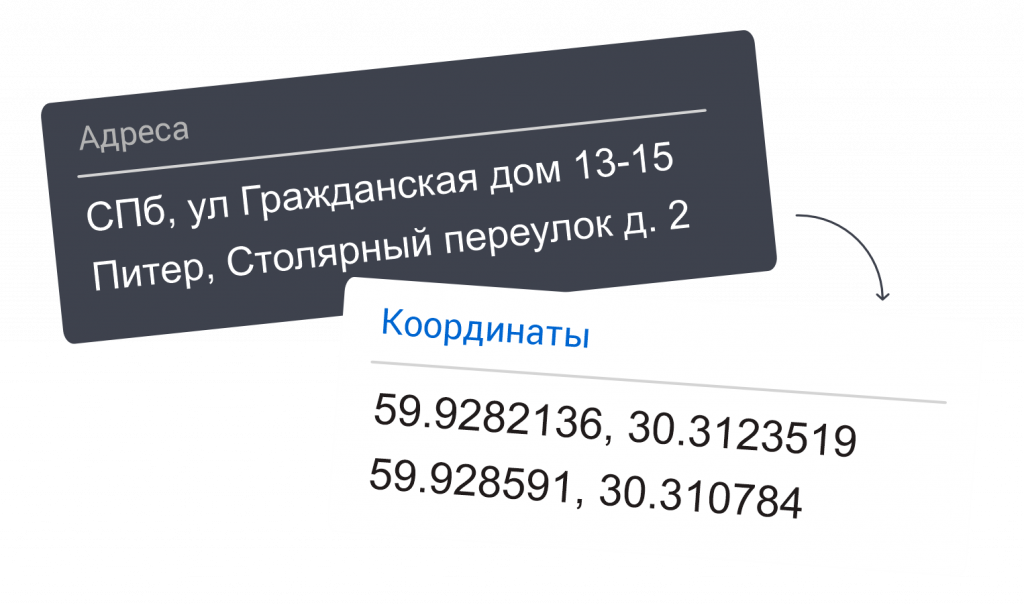 Онлайн-сервис для определения координат по адресу — для домов, улиц, городов в России. «Дадата» определяет координаты, связывая данные из OpenStreetMap с адресами из ФИАС.