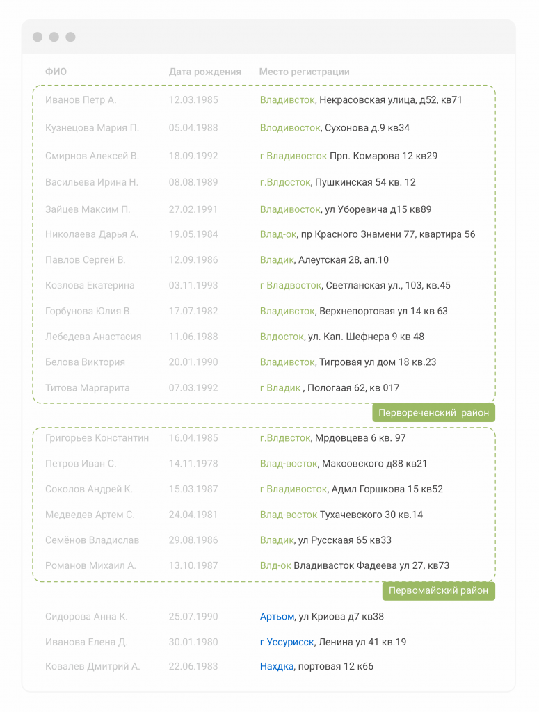 Если же спор пойдет о том, в каком из районов Владивостока давать рекламу, адреса вообще не помогут. Стандартный адрес содержит город и улицу, но не район. Придется искать районы вручную. А на выходе снова получится текст без привязки к карте.